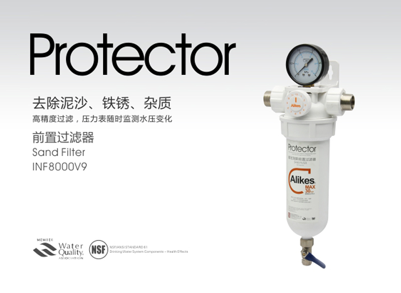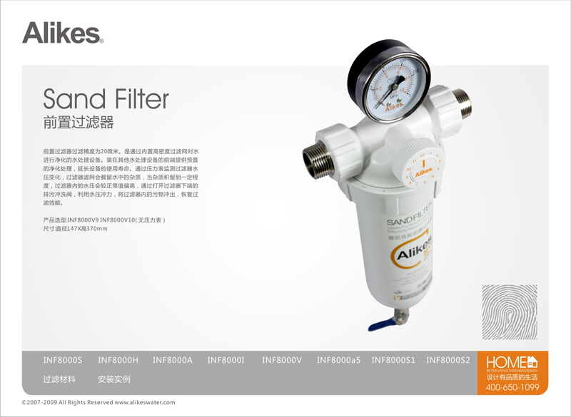 Alikes前置過濾器是通過內置高密度過濾網對水進行凈化的水處理設備。過濾精度為20微米。裝在其他水處理設備的前端提供預置的凈化處理,延長設備的使用壽命。通過壓力表監(jiān)測過濾器內水壓變化,過濾器濾網會截留水中的雜質,當雜質積留到一定程度,過濾器內的水壓會較正常值偏高,通過打開過濾器下端的排污沖洗閥,利用水壓沖力,將過濾器內的污物沖出,恢復過濾效能。